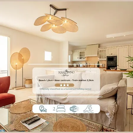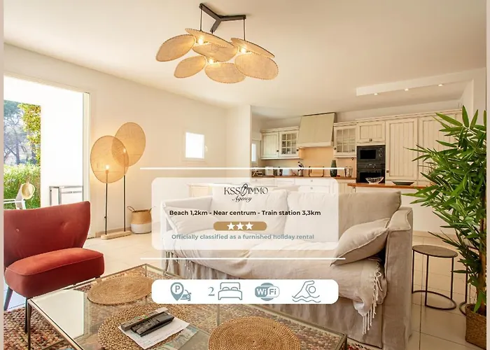 Das Apartment Charmant 73M Carre -Piscine-500 M De La Mer-Parking verfügt über einen Ankleidebereich und eine Sitzecke und Annehmlichkeiten wie eine Klimaanlage. Diese Unterkünfte bietet 2 Bäder. Außerdem stehen ein Haartrockner und Badelaken zur Verfügung.